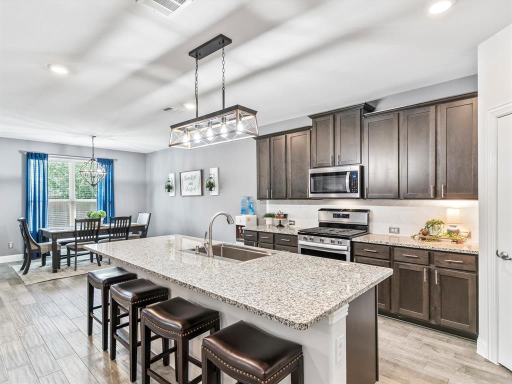 Welcome to this beautifully upgraded 4-bedroom, 2-bath home nestled in one of the most welcoming and tight-knit communities around. Situated on a rare and coveted 60-foot lot—no longer offered by the builder—this home features a unique floorplan and elevation, one of only three in the entire neighborhood. Inside, you'll find a host of thoughtful upgrades including an extended and enclosed back patio, whole-home surge protection, an enlarged pantry, and a hidden garage screen perfect for transforming the space into a workshop or home gym. The stunning kitchen is a true centerpiece with its massive 9-foot granite island, deep farmhouse sink, and ample space for entertaining. The spacious primary suite boasts dual walk-in closets, while the exterior offers a larger front porch and extended driveway for added convenience. Located in a highly desirable subdivision with fantastic amenities—pool, splash pad, pickleball court, food truck area, and a second amenity center with another pool on the way—this home blends comfort, style, and community living at its finest.