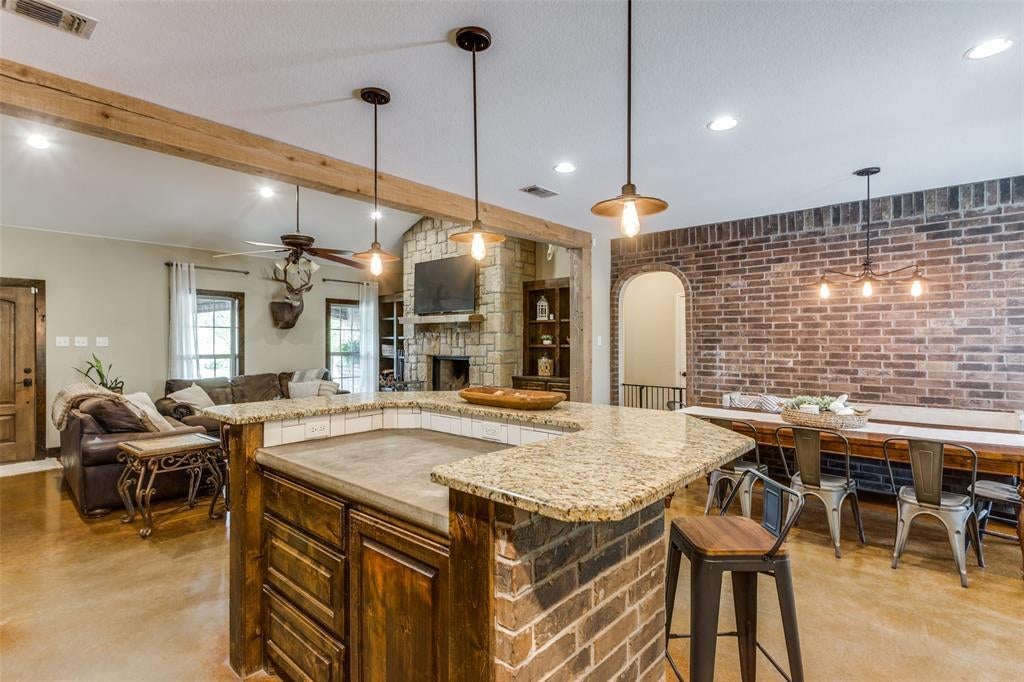 *PREFERRED LENDER OFFERING 1% TOWARD CLOSING COSTS* Bring your Horse & Chickens to this One Owner Custom Beauty! The heavily wooded lot and arched front porch welcome you into this open concept home with newly polished concrete flooring, exposed brick walls, wood beams & knotty alder cabinetry throughout. The formal study is perfect for working from home with its custom barn door and vaulted ceiling. The living room is large w beamed casings, a floor to ceiling stone fireplace w oversized hearth & 15ft ceilings accented w wood beams. The farmhouse kitchen has bar seating, polished concrete & granite counters, a custom hammered metal vent hood, subway backsplash, a pot filler, stainless appliances and stunning light fixtures. The dining will bring great conversation beside the heavily textured exposed brick wall. The primary ensuite has dual vanities, a sitting vanity, linen closet, large walk in shower & two walk in closets. The secondary beds down are large w ample closet space and have direct access to the full bath with two vanities and shower tub combo. The utility is large with space for kennel, cabinets & room for freezer. Upstairs enjoy the brand new carpeted 2nd living flex space that makes the perfect game room, media, craft room or 2nd office. Outside enjoy seating under the tin underbody 23x10 covered patio, many trees, fully fenced pipe & rope yard & full size dog kennel. Well w good pressure & instant hot. Country Living with modern Amenities & Ease of access to retail. 2025 Well Serviced. 2022 New HVAC. Septic has new motor w 2 year warranty. Inspected and Pumped June 2025 with 1 year warranty.