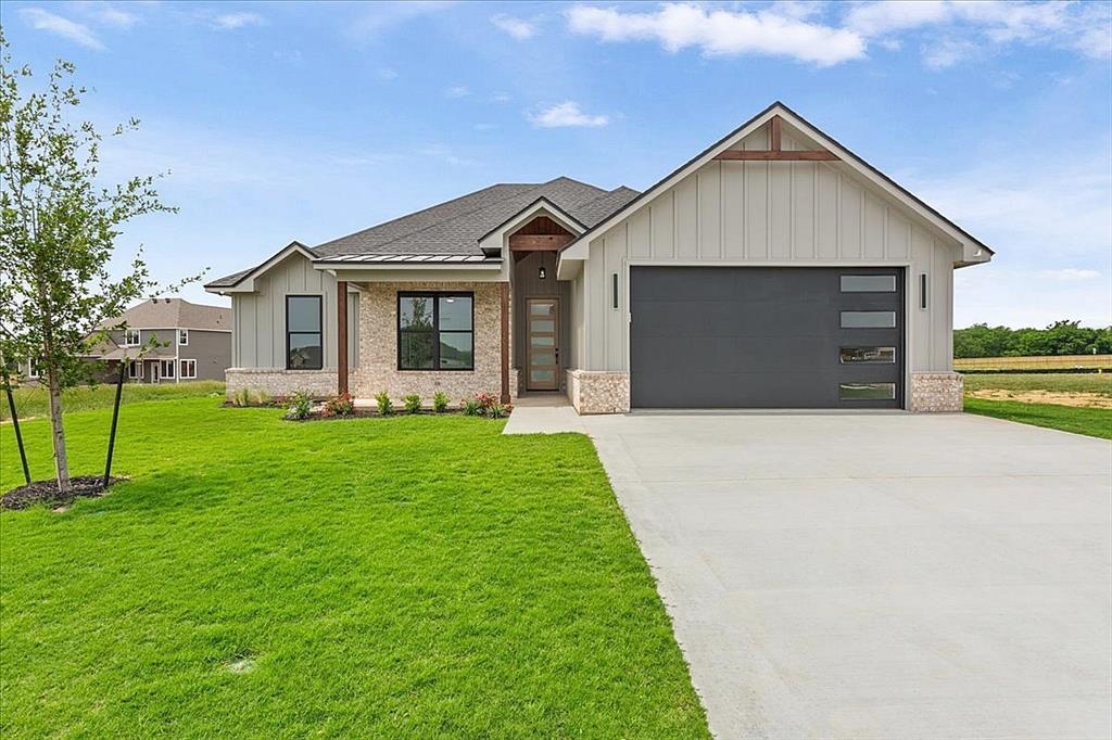 Stunning Stone & Siding Home with Designer Finishes in Prime Location. This thoughtfully designed 3-bedroom, 2-bath home seamlessly blends charm, comfort, and modern elegance. Upon arrival you will notice the striking stone and siding exterior, accented with rich wood corbels, posts, and details, all surrounded by meticulous landscaping. Step inside to discover open-concept living spaces highlighted by 9-foot ceilings, abundant natural light, designer paint colors, recessed and designer lighting throughout. The spacious living area features a modern electric fireplace insert with color-changing flames, luxury vinyl flooring flows seamlessly throughout the home, leading you into a gourmet kitchen equipped with upgraded appliances, quartz countertops, breakfast bar, and ample cabinetry for extra storage. The adjoining dining area is perfect for hosting family and friends. The private primary suite features a huge walk-in closet with built-ins, dual vanities, recessed lighting, quartz counters, and a spa-like floor-to-ceiling tiled walk-in shower. Two additional bedrooms offer plenty of space and comfort, sharing a stylish full bath with quartz counters, recessed lighting, and another beautifully tiled walk-in shower. Step outside to a covered patio with a rich wood accented ceiling and ceiling fan—ideal for relaxing or entertaining. The oversized backyard is fully enclosed with a wooden privacy fence and offers plenty of room to roam or garden. Additional features include a spray foamed attic for energy efficiency, full irrigation system (front and back), 220 V breaker perfect for electric car charging. Just minutes from both Waco and China Spring, 10-20 minutes from Baylor University, Cameron Park, the Magnolia Silos, and all the attractions of downtown Waco. Don’t miss this opportunity to own a truly move-in-ready home with high-end touches in a location that balances peaceful living with city convenience.
