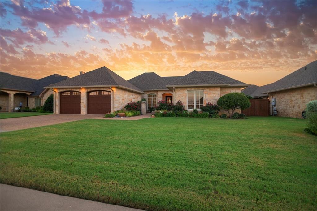 Beautiful southwesterly views of Lake Waco and beyond can be seen from this exquisite home, tucked securely behind the gates of the Oaks @ Ridgewood. A gated front courtyard with lush, mature landscaping and double carriage-style garage doors welcome your guests into the heart of the home, where you’ll find top-of-the-line construction including vaulted ceilings, wide crown molding, plantation shutters, and roll-up shades. The oversized kitchen offers an island workspace with plenty of seating, GE Monogram stainless appliances including a six-burner gas cooktop, built-in oven, Advantium oven, warming drawer, plus a built-in refrigerator-freezer with matching cabinet fronts. Adjacent to the kitchen is a butler’s pantry (or coffee station!) and large laundry room with additional storage and counter space. The main living area has a stone fireplace with gas log inset, vaulted ceilings, and large windows with spectacular views. Between the living area and kitchen is a large dining area with access to a covered side grilling patio. An additional room off the main entry, which could be used for a second living area, formal dining room, or office has a wall of windows overlooking the rear patio which features a large covered area, pergola, and curved stone half wall. The master bedroom at the rear of the home looks over the backyard and its private bath has two vanities, a separate tiled shower and soaking tub, and a large walk-in shower with built-ins. Each of the two guest bedrooms has its own private bathroom and walk-in closet, plus a classic powder room near the main entry is available for guests. There are so many quality finishes such as a stained wood and decorative iron fence, gutters, and a coated garage floor.