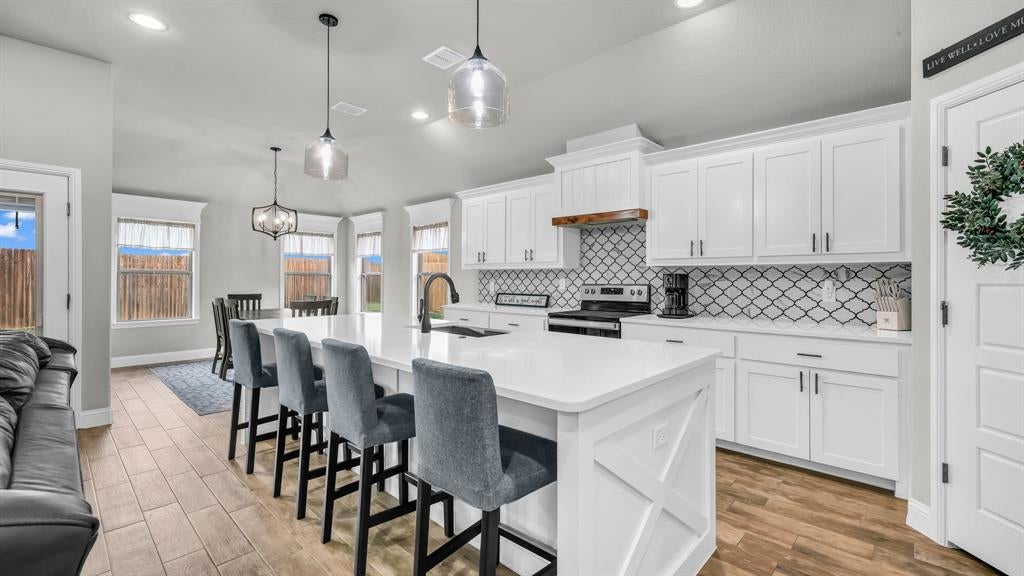 Welcome to this stunning like-new home in the highly sought-after Hadley Farms community! This 3-bedroom, 2-bathroom home feels semi-custom, offering an open floor plan with elegant chevron-laid wood-look ceramic tile, granite countertops, designer tile backsplash, and decorative lighting. The beautiful kitchen is complete with a refrigerator, large island with room for barstools, and a walk-in pantry. It flows seamlessly into the spacious dining and living areas, perfect for entertaining. Custom touches include barn doors, a cozy shiplap-accented sitting nook, stylish window treatments, classical craftsman trim details, and thoughtfully designed tilework throughout the bathrooms. The private office, dedicated laundry room, and attached garage add function to the beautiful form. The primary suite features a large walk-in closet, and attached bathroom with a long vanity, double sinks, and a seating bench. Enjoy the fully fenced backyard with a covered patio, ideal for outdoor living. Additional highlights include a sprinkler system, security system, smart home package, and roof-mounted solar panels—fully paid off at closing—providing energy efficiency and lower utility bills. Move-in ready with designer details throughout — this home is a true must-see!