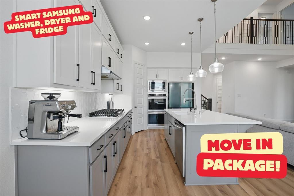 MOVE IN PACKAGE! SAMSUNG SMART WASHER & DRYER AND SAMSUNG ENERGY STAR FRENCH DOOR REFRIGERATOR!!! PLUS FREE HOME INSPECTION. This home qualifies for a $0 DOWN, NO PMI LOAN, call us for more information. Located in Sandbrock Ranch— pride of ownership is evident throughout—this immaculate SOUTH FACING 4-bedroom, 3-bathroom home offers a blend of thoughtful upgrades, comfort, and long-term investment value featuring spacious living areas and custom touches throughout. The kitchen is both functional and elegant, boasting upper cabinetry, under-cabinet lighting, a reverse osmosis water system, dual ovens, black matte hardware, a 5-burner gas cooktop, and a built-in trash can pull-out.The open-concept living area is bathed in natural light and showcases soaring vaulted ceilings, striking decorative lighting, and a dramatic floor-to-ceiling brick fireplace that anchors the space. Just off the main living area, a formal dining room provides an ideal setting for hosting gatherings and special occasions. Upstairs, a large loft is thoughtfully divided into two separate areas, offering endless flexibility for use as a media room, home office, playroom, or additional lounge space. Two generously sized bedrooms with walk-in closets share a full bathroom with dual sinks—ideal for families or guests. The primary suite on the main floor offers a cozy bay window sitting area, and a spacious walk-in closet equipped with seasonal rods for organized storage. A fourth bedroom and full bathroom are also located downstairs, creating a perfect guest suite or in-law setup. Throughout the home, you'll find upgraded carpet with premium padding and stylish open railings that enhance the overall aesthetic and flow of the space. Included with an acceptable offer are the refrigerator, washer, and dryer, adding extra value and convenience for the new homeowner.