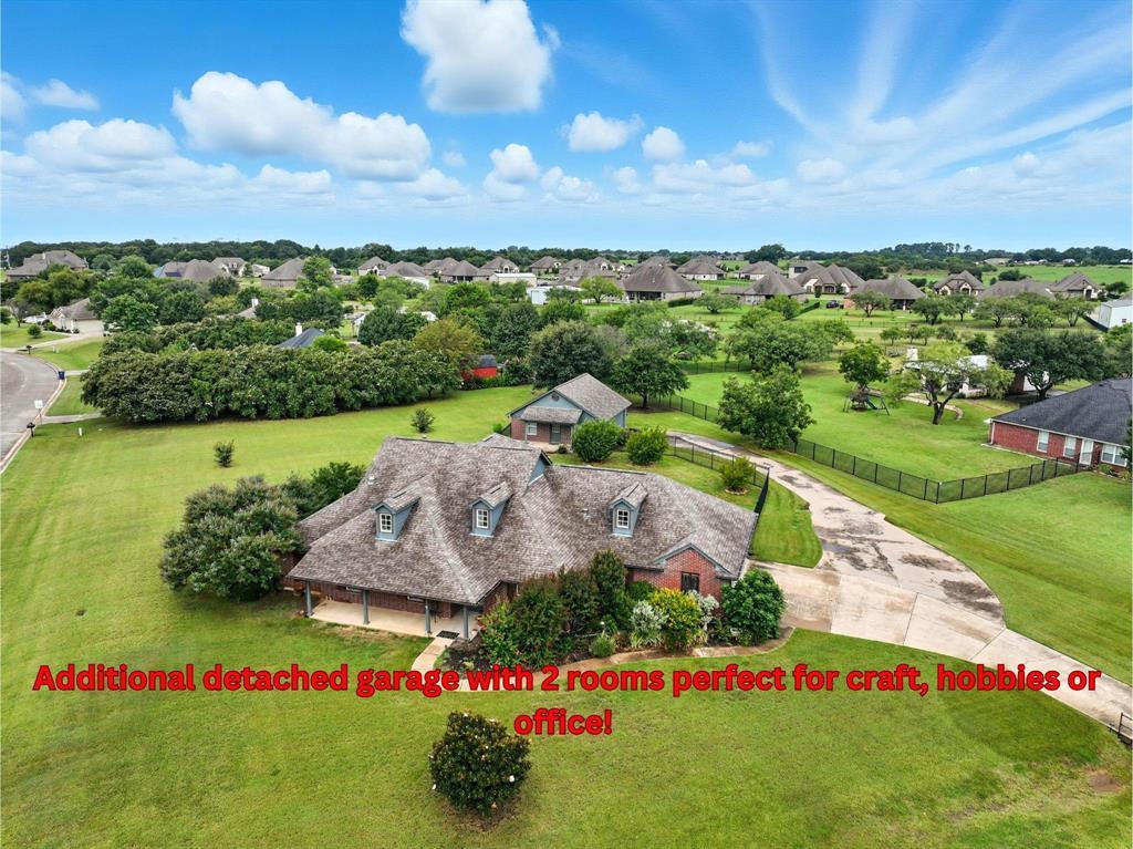 Gorgeous opportunity to own a home in Joshua Meadows situated on 1 acre corner lot!! This home has room for everyone with 4 bedrooms, formal living and dining, 3 baths and all rooms are downstairs except flex room upstairs! The formal dining features built in cabinets perfect for holidays or parties. Formal living could be an office or additional bedroom! Living room features a cozy gas fireplace and is open to the kitchen! Kitchen is very large and is perfect for the chef in the house! Walk in pantry, large breakfast bar, built in desk area, island, stainless appliances. Primary featires an ensuite bath and a door that leads to the patio! Primary bath has walk in closet, dual sinks, separate shower, jetted tub. Additional beds are large! Sunroom behind the living area is perfect to sit and relax or perfect spot for pets! Upstairs you will find a large flex space perfect for a gameroom, office, play room! Out back is an approximately 800 sq ft detached garage complete with electricity and two additional rooms for office or storage! This home has everything you need!