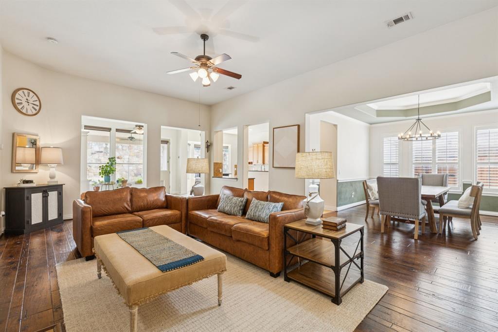 Welcome to an ideal single-story, 3 car on a quarter acre in The Landing at Waterstone! This 3-bedroom beauty has space for everything with three versatile living areas, a dedicated office featuring a coffered ceiling, a bay window, and French doors plus a 3-car garage and a massive driveway for all your cars, bikes, guests and outdoor sports fun! Quarter-acre lot with a private backyard feels like your own retreat, complete with a covered patio. The sunny solarium-style sunroom makes a great playroom, home gym, or morning coffee spot with a view. Need more flexibility? The open den is ready for movie nights, a second office, or a creative zone. The kitchen has granite counters, a 5-burner gas cooktop, commercial-style faucet, loads of cabinetry and a spacious pantry. The breakfast area features a bay window overlooking the backyard and built in cabinets. Formal dining in tasteful paint colors with chair and crown molding and a tray ceiling. Spacious primary suite with wood floors and a bay window. The primary bath has split double vanities, spacious walk in closet, and a mini tub that's perfect for your pup! Two additional bedrooms are spacious with reach in closets and share a Jack & Jill bath. Hardwood floors in most living areas including the primary bedroom. Plantation shutters, 8' solid core doors, crown molding throughout, 220v wiring in both garages, and a laundry room with a sink, storage, and private entry to that oversized driveway. A unique feature is the custom double-gated entrance to the backyard. All of this in Waterstone, with beautiful open green space, a private lake, pool, clubhouse, and playground. You’re minutes from Wynnwood Park, PGA Frisco, Lewisville Lake, and top-rated Frisco ISD schools. Great floor plan with so many versatile options and room for hobbies, work, play, or guests. Whether you’re hosting friends, planting a garden, or finally getting that Peloton room, this home checks every box!