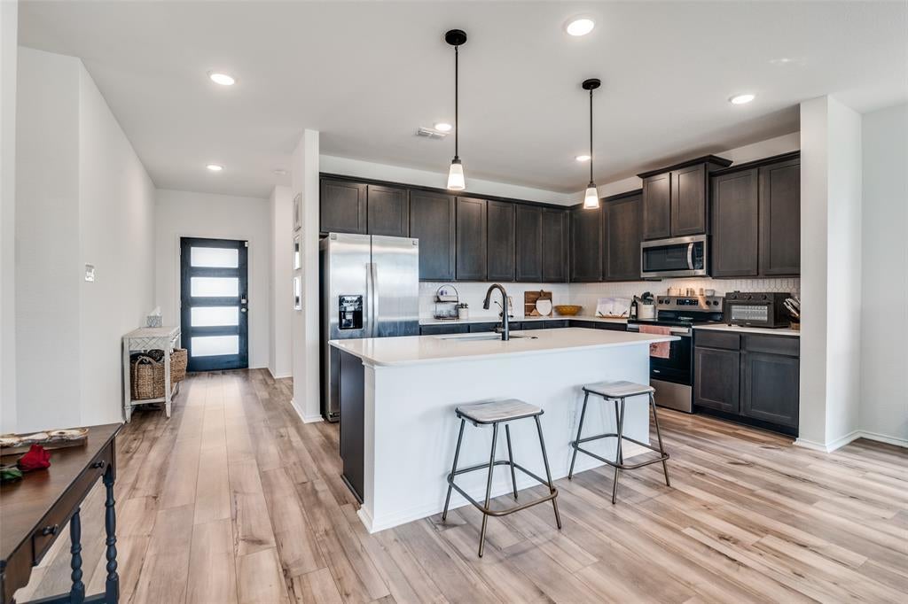 MOTIVATED SELLERS! Bring all offers! This thoughtfully designed History Maker home is essentially brand new, built in 2024. With 4 bedrooms and 3 full baths, there’s plenty of space to spread out, live comfortably, and entertain with ease. Enter through the beautifully upgraded front door and be greeted with tons of open space and natural light. The heart of the home is the stunning kitchen, featuring 42” smoke cabinets, a large island, frost white quartz countertops, and an upgraded white mosaic backsplash — perfect for cooking up memories with family and friends. You’ll love the luxury vinyl plank flooring throughout the main living spaces and the timeless curb appeal of the classic brick exterior. The bathrooms shine with sleek tile floors and beautifully tiled shower and bath walls, creating a clean, elevated feel. Step outside to your own backyard retreat with a large covered patio, green well maintained grass, landscaping, and full irrigation — ready for summer evenings and weekend BBQs. And when you’re ready to explore, Heartland has over 400 acres of community amenities, including scenic walking trails and multiple pools, making it easy to soak up the good life right outside your door. As a bonus, the refrigerator and washer + dryer all stay with the house, making this move-in ready gem even sweeter.