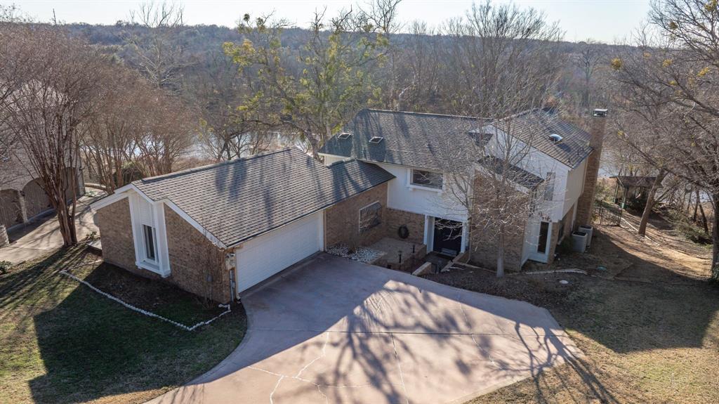 Riverfront Retreat in Pecan Plantation! This unique contemporary home sits on a quiet cul-de-sac with walk-down access to the Brazos River—perfect for fishing, floating, or soaking up the sun. This property has NEVER flooded. Located in the sought-after Pecan Plantation golf community, this home offers stunning river views from most rooms. The main level is designed for entertaining, featuring fresh paint, an updated kitchen with granite countertops, new cabinets, and backsplash, plus a dining room with built-in buffet. The living room’s wood-burning fireplace, flanked by open bookshelves, creates a cozy focal point. Upstairs, the spacious primary suite includes a private coffee bar and balcony with panoramic river views. A dedicated office adds flexibility. Outside, enjoy a fenced yard, fresh sod, and well-maintained landscaping. Additional features; sprinkler system, and oversized two-car garage with golf cart space. An hour from Fort Worth, this home offers the perfect mix of serenity and convenience. Don’t miss this one—schedule your showing today!
