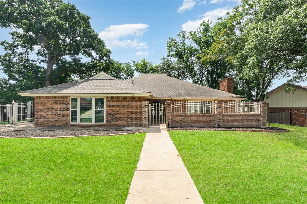 Charming one-story home nestled in the heart of Bedford! Over-sized front living with built-ins & wood burning fireplace with sliding glass doors leading to a private courtyard in the front, perfect for that morning cup of coffee. The dining opening to a wet bar, great for entertaining. Kitchen is spacious with stainless steel appliances, granite counter tops, large island w bar seating, & the breakfast eat in area with large bay windows. Lots of windows throughout, which makes this home light and bright! Primary suite has dual sinks with a frameless walk in shower. The extended driveway wraps around to a quaint sized backyard & privacy fence with a flagstone walkway, patio & shed. Create your own backyard oasis. Just a short stroll from Cliff Nelson Park, the neighborhood offers a blend of tranquility and accessibility. Some virtually staged photos, items will not appear at the property.