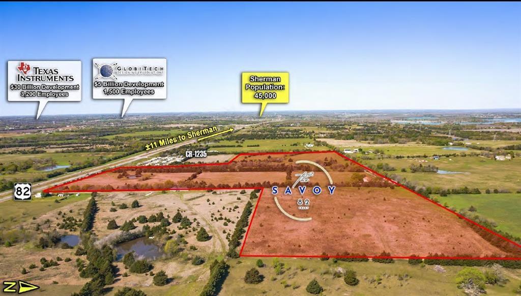 RV Park, Flex Office or Manufactured Home opportunity with no zoning restrictions! The tract is a distinctive land opportunity located at the northeast corner of FM 1235 and Hwy 82 in Savoy, Texas. This property spans roughly 64.575 acres, showcasing 770 feet of frontage on Hwy 82, and includes a residence currently under a leasing agreement. Thanks to an agricultural exemption, Savoy 82 enjoys a reduction in tax liability, making it an even more attractive investment. Situated just 59 miles north of Dallas, the site is within a 45-minute drive of a workforce exceeding 550,000, offering substantial accessibility and potential for various development projects and investment potential. Given its position outside city limits, the property comes with few use restrictions, presenting a versatile opportunity. The proximity to Bonham, just 8 miles east, with a population of 27,000 and the recently opened Bois d’Arc Lake, hints at a vibrant area on the cusp of growth, expected to generate around 2,400 new jobs. Furthermore, being 11 miles from Sherman, a city with a population of 45,000 and undergoing massive expansions such as the Texas Instruments Chip Manufacturing Facility and Globitech’s $5 billion expansion, indicates a region brimming with economic activity and potential. These developments are anticipated to create thousands of jobs, reinforcing the area’s economic base. Additionally, the recent announcements from Hard Rock Hotel and Margaritaville Resorts about establishing locations on Lake Texoma, merely 35 miles north, suggest an increase in tourism and leisure opportunities, further enhancing the property’s appeal. Savoy 82 is not just a piece of land; it’s a gateway to a myriad of development possibilities, fueled by the surrounding economic expansions and the increasing appeal of the region.