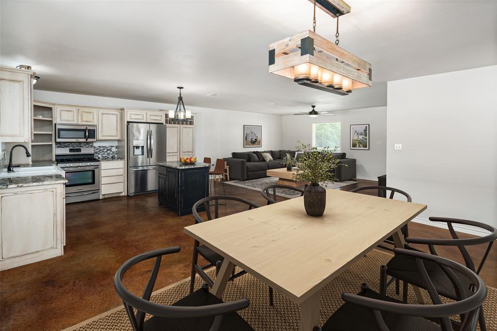 The drive home is filled with scenic country views & the only traffic jam you are likely to experience is the occasional tractor headed to the neighbor's field. Pretty 5.6+ acres is fully fenced, the lush natural tree line creates a depth of privacy. The gated entry is your first hello and the first glimpse of the flagpole. The furling red, white & blue flag has long been a staple here, the sellers will leave for the next owners to enjoy. The rustic barndominium is pretty, with deep, rich chocolate tones, stone accents, BIG porches and a recent covered parking extension, offering a great amount of covered parking. With open views, the living, dining & kitchen areas create an inviting space to enjoy daily living or accommodate a crew of your favorite people. This low maintenance, versatile home features an eye-catching kitchen with a fantastic island, built in wine rack & amazing light fixtures that showcase the farmhouse style. The primary BR is filled with natural light, the ensuite is convenient & full of charm! Two additional BR & a full bath, stylish colors and nice windows. A detached 600 sq ft game-flex room is outstanding for parties, watching the game, comes with a standard pool table & shuffleboard game, with impressive tall ceilings, loaded with personality! The multifunction 1200 sq ft shop is perfect for car enthusiasts, ranch equipment, storage, foam insulated work space with additional covered parking. Great overhead lighting, the incredible wood burning stove keeps it cozy! Property is cross fenced & livestock ready. The loafing shed, chicken coop & expansive dog pen make country living easy! The recently added inground storm shelter is top of the line. Great location, the serenity here will make you never want to leave home. And when you do, it' a destination to hurry back to every single day. Minutes from the new Leonard ISD Elementary, High School & sports facilities. Easy commute to McKinney, Sherman & DFW airport.