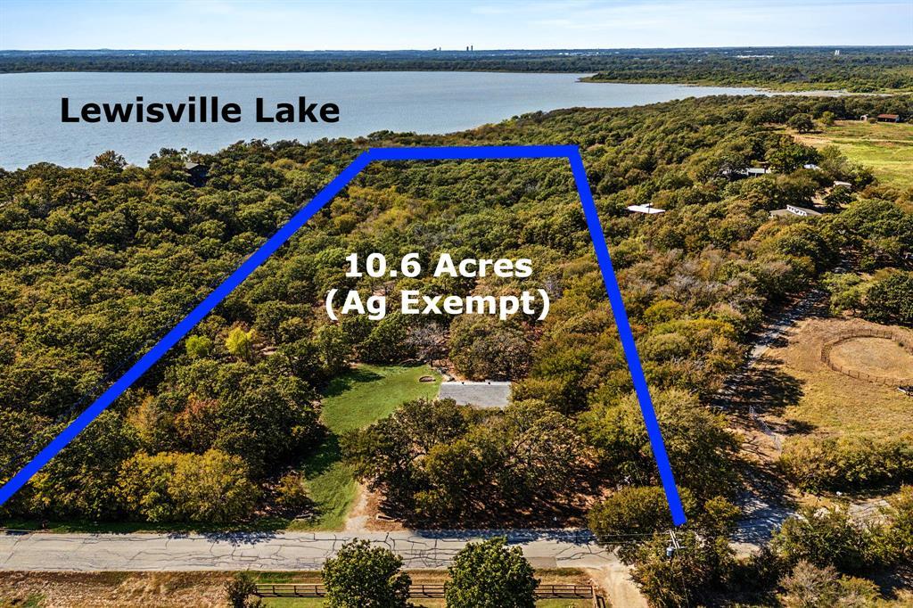 10 + ACRE AG EXEMPT WOODED LOT DIRECTLY ON LEWISVILLE LAKE! Very low property taxes with no municipal charges - only 1.34 percent! The rolling topography with native vegetation provides a refuge from the bustle of the city, while still being near all the conveniences DFW has to offer. This property offers endless possibilities; a canvas to craft a retreat that mirrors your imagination. Picture your dream home nestled amongst the trees, where windows frame a picturesque view of nature and stunning sunsets. Choose from multiple build sites with captivating lake views. A birdwatcher's paradise, many beautiful species visit or call this property home including the stunning painted bunting! All this, while enjoying the low taxes of an agricultural exemption. Don’t just dream of escaping the ordinary – make it your reality. Truly a rare opportunity.