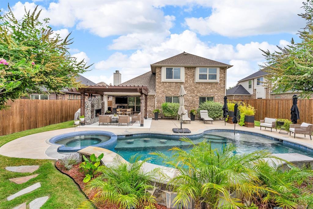 Step inside to find a welcoming home office and three spacious bedrooms, all conveniently located on the first level along with three full baths. Upstairs, you’ll enjoy a large game room and an additional full bath. Game room is equip with LED lighting, speakers. The heart of the home is the deluxe kitchen, featuring all-gas appliances, a decorative fireplace in the living room, an open floor plan, and a chef’s island with a buffet bar—perfect for entertaining. Outdoors, a heated pool with spa and fireplace sets the scene for year-round enjoyment. The backyard has been thoughtfully upgraded with a fireplace, extended deck, and shaded patio for relaxing or hosting. The oversized garage offers more than two-car space, plus room for tools or toys, and even a private access door to the backyard. Inside, you’ll find details like crown molding and a reimagined primary suite with a large sitting area. The spa-style bath features a standalone shower with dual temperature-control showerheads, upgraded vanities, flooring, and more. Community amenities include a basketball court, sand volleyball, pool, walking trails, ponds, and more. Don’t miss the chance to make this incredible home yours—schedule a tour today!