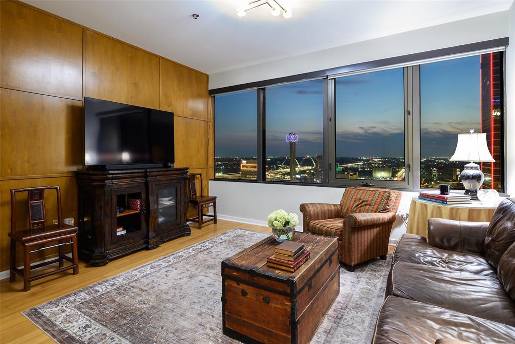 Perched high above the city, this luxury condo offers sophisticated living and panoramic views of the Dallas skyline w. breathtaking vistas of the iconic Reunion Tower and Margaret Hunt Hill Bridge. Boasting an open floor plan this condo is designed for both comfort and style. The warm, contemporary interior is bathed in natural light, creating an airy ambiance that complements the stunning views. An open kitchen w. stainless steel appliances and ample cabinet storage overlooks the living room w. dining alcove and adjacent covered terrace. Primary bedroom offers a walk-in closet and spa bath w. tub and sep shower. A secondary bedroom or den w. closet affords an opportunity for additional flex space. Convenience meets luxury w. the carefully curated amenities of the building including 24-7 concierge, full gym, pool deck w. spa and BBQ grills, conference room, media room and secure parking.