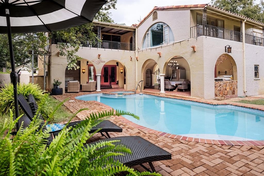 Spanish-Style Historic Gem with Modern Upgrades! Stunning 3,970 sq ft Spanish-style home built in 1927, beautifully remodeled while preserving its original charm. Situated on a spacious corner lot, this 3-bed, 2.5-bath property features acacia wood floors, granite countertops, a custom stone kitchen wall, walk-in pantry, Viking Professional 6-burner gas stove, and stainless appliances. The main-level primary suite offers a spa-like bath with slate floors, copper accents, footed tub, double vanity, and large walk-in closet. Enjoy three fireplaces, leaded stained-glass windows, and an original beamed game room upstairs with views of the resort-style backyard. Outdoor living includes a replastered pool, custom outdoor kitchen, two courtyards, covered patios, and an outdoor fireplace—all shaded by mature pecan trees. Additional highlights: St. Charles cabinets, custom wine bar, blown-in insulation over downstairs living, and sprinkler system. This home blends historic elegance with modern comfort—perfect for entertaining or quiet luxury living.