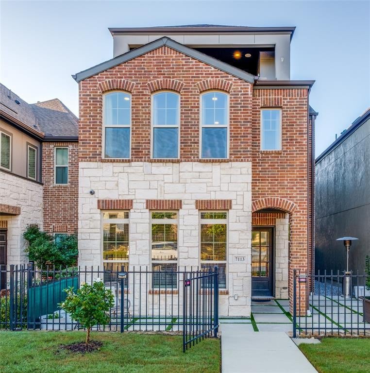 Sophisticated and effortlessly modern, this three-story former model home offers designer upgrades at every turn. The open-concept main level flows seamlessly from the elegant living and dining areas to a chef’s kitchen featuring a statement island, gas cooktop, sleek granite counters, stainless-steel appliances, and a refrigerator included. Natural light fills the space through expansive windows and rich hardwood floors. The second-floor primary suite serves as a serene retreat with a spa-inspired bath, dual vanities, soaking tub, and walk-in shower. The third floor impresses with a spacious game room, guest bedroom, full bath, and a covered rooftop deck designed for sunset gatherings and skyline views. A Tesla charger is conveniently installed in the garage, and the washer, dryer, and refrigerator all convey with the home. Overhead garage storage shelving will also remain, adding valuable organization and functionality. With a rear-entry two-car garage, low-maintenance landscaping, and direct access to White Rock Trail, dining, and shopping, this residence offers a refined lock-and-leave lifestyle in the heart of Lake Highlands Town Center.