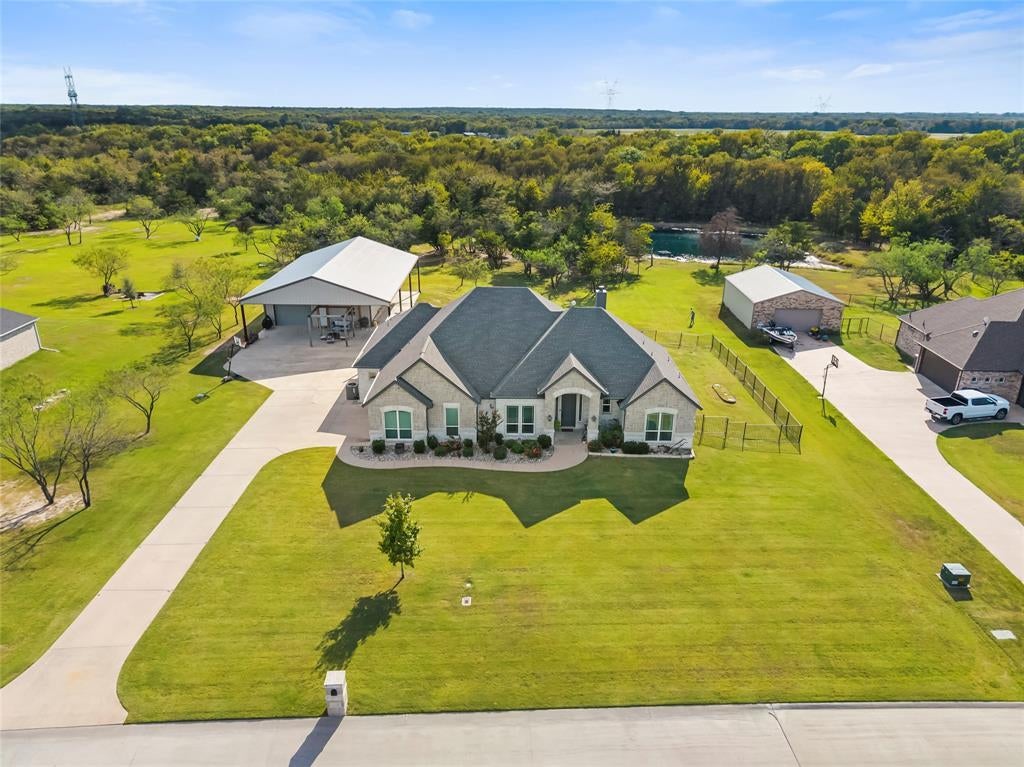 Welcome to your dream retreat, nestled on 2 sprawling acres of beautifully landscaped grounds, where luxury, functionality, and outdoor adventure meet. This impressive custom-built home invites you to experience a lifestyle of elegance and excitement. Step inside to discover hand-scraped hardwood floors, granite countertops, gourmet kitchen featuring a gas stovetop, double ovens, and expansive walk-in pantry. The open-concept design offers plenty of seating and counter space, ideal for entertaining, while a stone fireplace with gas logs creates a cozy ambiance. A dedicated office with a closet provides flexibility, easily converting to a bedroom if desired. Indulge yourself in the primary suite, including a massive walk-in closet with custom shelves, drawers, a spa-like bathroom with walk-through shower equipped with body sprayers, and separate jacuzzi tub. Outside, the sparkling pool, completed in 2024, is the centerpiece of a backyard paradise, with a heater and chiller for year-round enjoyment, multiple water features, and a tanning ledge. It’s perfect for entertainment. The full outdoor kitchen and poolside bath, doubling as a tornado shelter, add convenience and safety. The grounds, illuminated by front and backyard tree lighting, will create a magical evening. Adventure awaits with a treehouse, zip line, a stocked fishing pond, and greenhouse with 8 raised garden beds, while the 20x16 pole barn offers storage or project space. The ultimate 45x70 total, inside and out shop, is a craftsman’s dream, equipped with compressor lines, closed-cell insulation, AC-Heat featuring a full bath, a stylish man-cave bar, a media room with a Murphy bed for guests, and a 2nd guest room. With a 6-year-old roof and 1-year-old AC, this home is practical and luxurious. Surrounded by wildlife charm, it’s ideal for families, hobbyists, or anyone seeking adventure and sophistication. This isn’t just a home—it’s a lifestyle. Schedule a tour to experience this extraordinary estate!