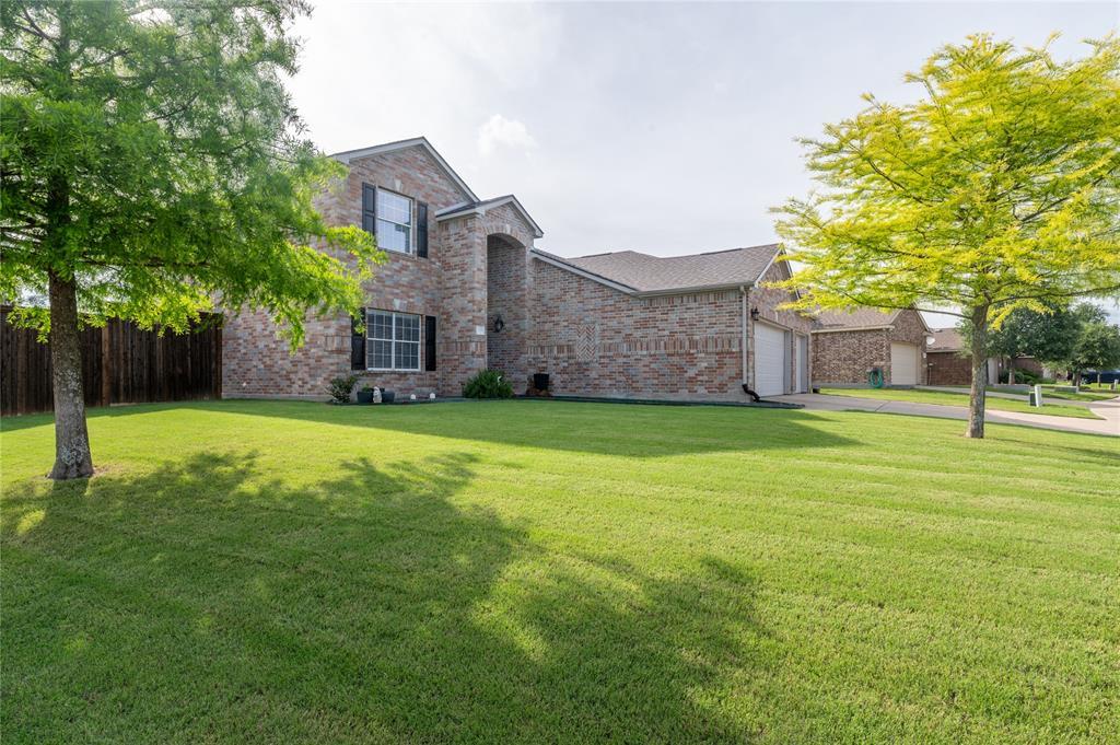 Situated on a large corner lot that offers extra space and privacy, this 4-bedroom, 2.5-bath home offers comfort, style, and space for everyday living. As you step inside, you’re greeted by an open foyer that sets a warm and inviting tone for the home. To your left, a dining room welcomes gatherings with family and friends. Continue in, and you’ll find a bright, open living area that flows seamlessly into the kitchen and breakfast nook, perfect for both relaxed mornings and lively evenings. The kitchen is the heart of the home, featuring quartz countertops, decorative lighting, and sleek finishes that blend function and beauty. Upstairs, you’ll find three comfortable bedrooms and a versatile playroom that can serve as a game room, home office, theater, or creative space that fits your lifestyle. With no carpet downstairs and modern paint color throughout, this home offers an easy-to-maintain and stylish environment. Step outside to a spacious backyard designed for enjoyment, complete with an extended patio, covered area, built-in grill, and storage shed. The oversized three-car garage offers soaring ceilings and plenty of room for a Texas-sized truck, extra storage, a workshop, or your next big project. With solar panels to help with energy costs and a convenient location just minutes from US-380, parks, and shopping, this move-in ready home truly has it all.