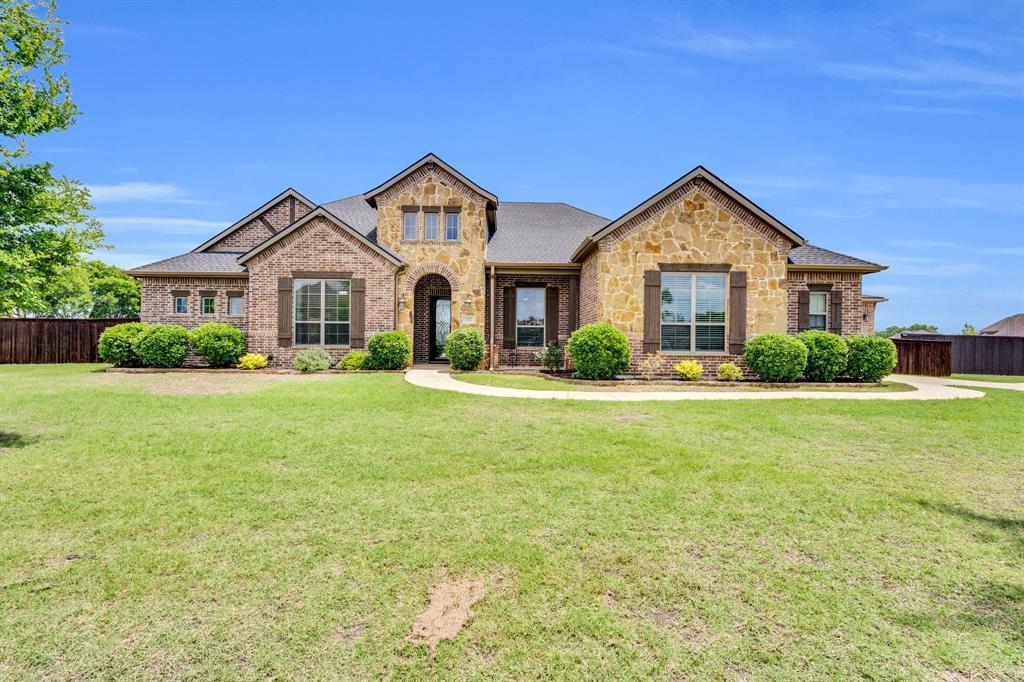 Welcome to this beautifully designed 4-bedroom, 2.5-bath home outside city limits in Waxahachie, offering just over 2,600 square feet of living space AND an oversized 22x32 attached garage —equipped with a 240V outlet for EV charging—that’s insulated, climate-controlled, and includes a rear roll-up door, making it ideal for a workshop, gym, or additional storage. From the moment you enter, you’re greeted by an open-concept layout that seamlessly connects the living room, kitchen, and dining area—all overlooking a backyard designed for both relaxation and recreation.The living room’s large windows offer uninterrupted views of the outdoor living spaces. The kitchen is both beautiful and functional, featuring rich, dark-stained cabinets that extend to the ceiling, a large island with granite countertops and seating, and a dining area with room to host a full-sized table. The seamless flow between these spaces makes everyday living and entertaining effortless. Tucked away for privacy, the primary suite includes a coffered ceiling, ensuite bath with dual vanities, separate shower and soaking tub, and a generous walk-in closet. Secondary bedrooms are located on the opposite side of the home, each with ample space and closet storage. A large laundry room and built-in mudroom provide practical organization for busy households. Step outside to discover a backyard that truly sets this property apart. Fully fenced and thoughtfully landscaped, the outdoor space includes two separate patios, fruit trees, raised garden beds, a fire pit, and a custom-built play tower.