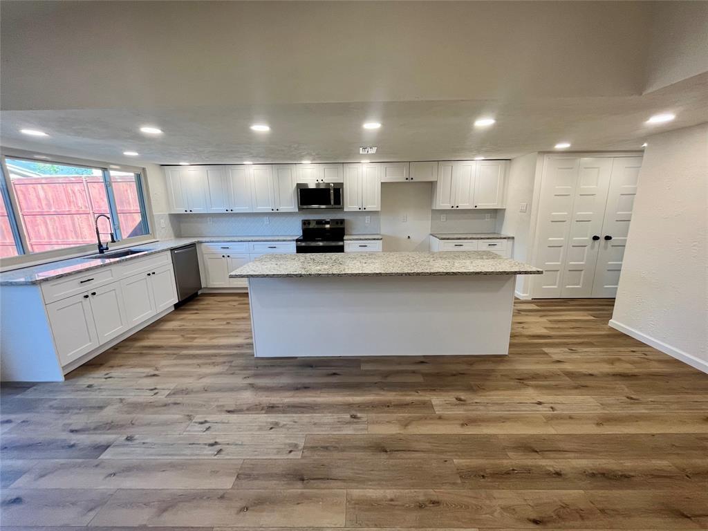 Welcome to 4713 Jennings Drive, a beautifully remodeled ranch-style home nestled in the heart of The Colony, Texas — just minutes from Grandscape, Lake Lewisville, and major commuter routes. This charming single-story residence combines modern elegance with timeless comfort, offering a fresh, move-in-ready retreat in one of North Texas’ most desirable communities. Every inch of this home has been thoughtfully updated with high-quality finishes and attention to detail. The open-concept layout is filled with natural light and showcases luxury vinyl plank flooring, fresh texture and paint, and modern black fixtures that create a cohesive, contemporary feel throughout. The spacious living room centers around a stunning white brick fireplace with a marble-style accent wall, creating a beautiful focal point for gatherings and cozy evenings. The fully renovated kitchen features white shaker cabinetry, granite countertops, stainless steel appliances, and an expansive center island with storage and seating — ideal for entertaining family and friends. A stylish barn-style pantry door adds a touch of farmhouse charm, while recessed lighting and a designer chandelier in the dining area complete the modern aesthetic. Both bathrooms have been completely remodeled with elegant tile work, granite vanities, and matte black hardware. The bedrooms are light, airy, and offer a relaxing retreat after a long day. Step outside to a large backyard with fresh landscaping and concrete patio, perfect for outdoor dining or peaceful mornings with coffee. With easy access to Highway 121, Dallas North Tollway, Grandscape, Nebraska Furniture Mart, Topgolf, and scenic parks along Lake Lewisville, this home offers the perfect blend of modern upgrades, convenient location, and small-town charm. Experience comfort, style, and Texas living at its best — this fully updated ranch home in The Colony is ready to welcome you home.